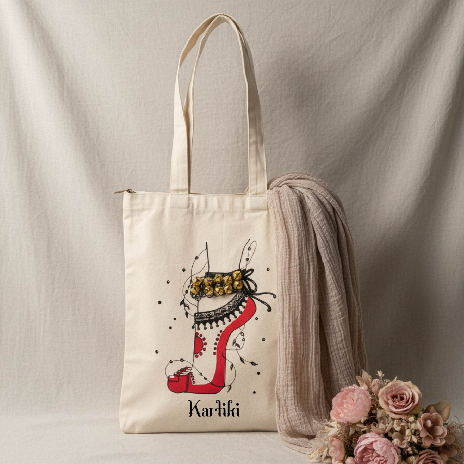 A beautifully crafted cotton tote bag designed to stand out with real ghungroo detailing. Personalise it with your name and carry a unique blend of style, culture and creativity every day.