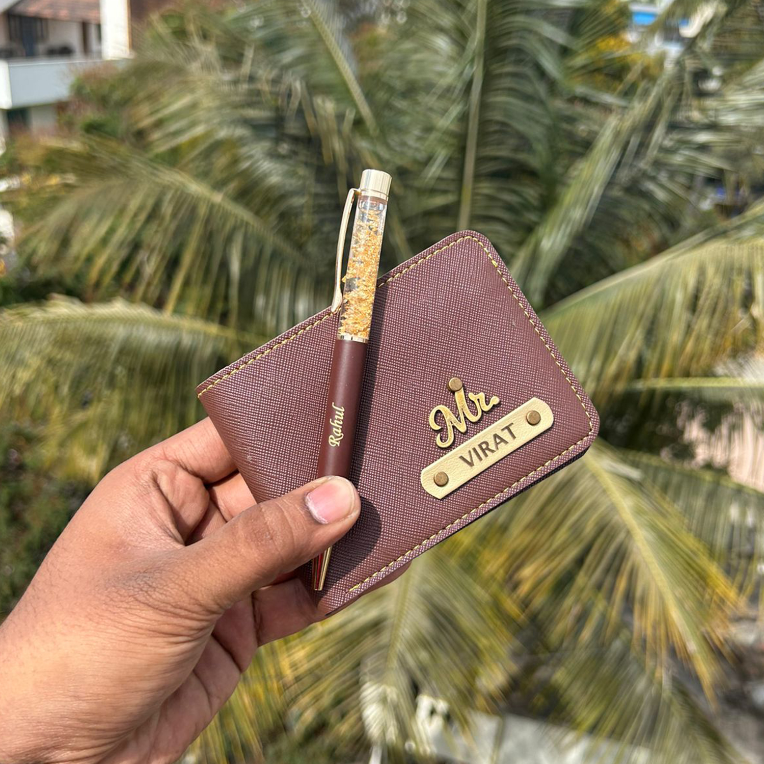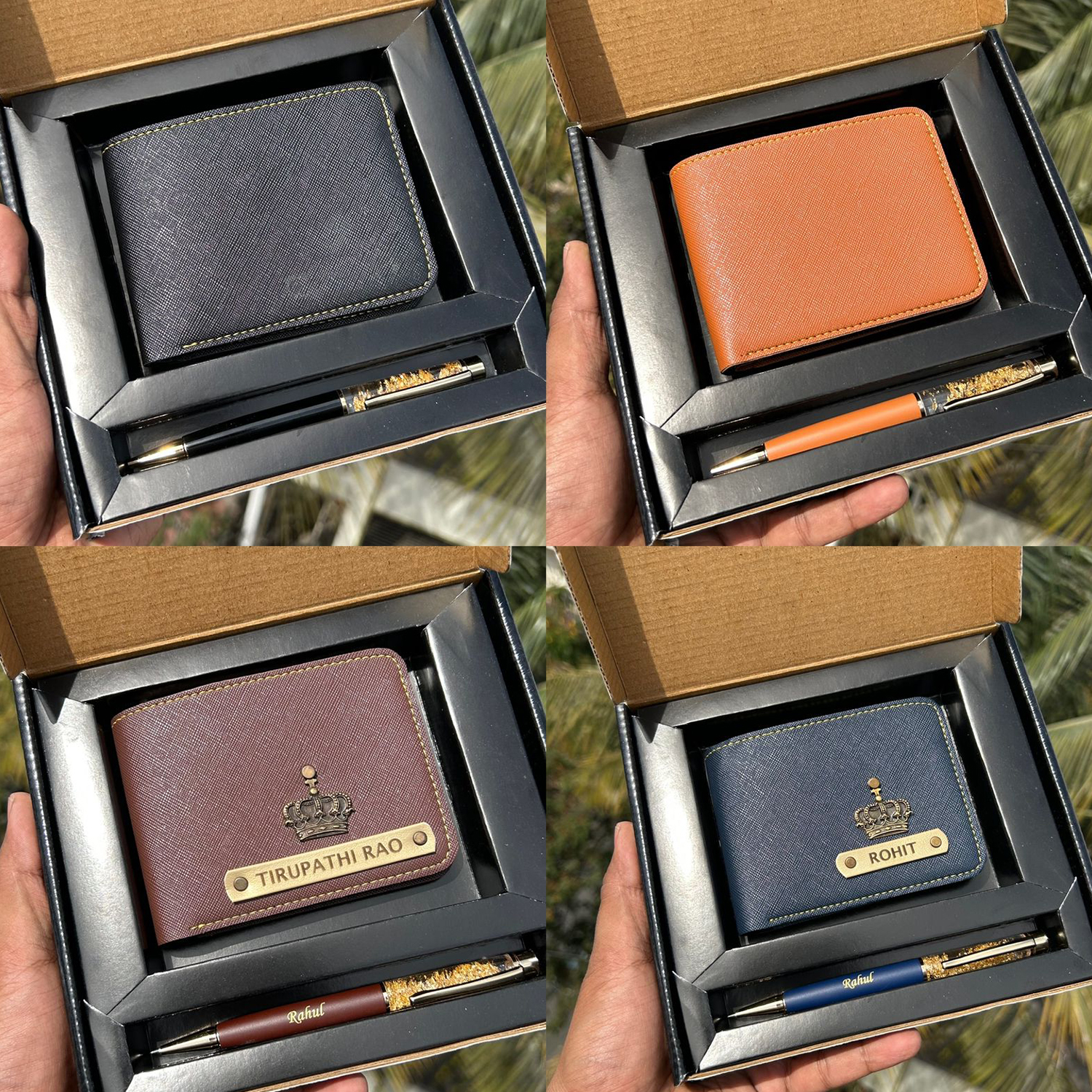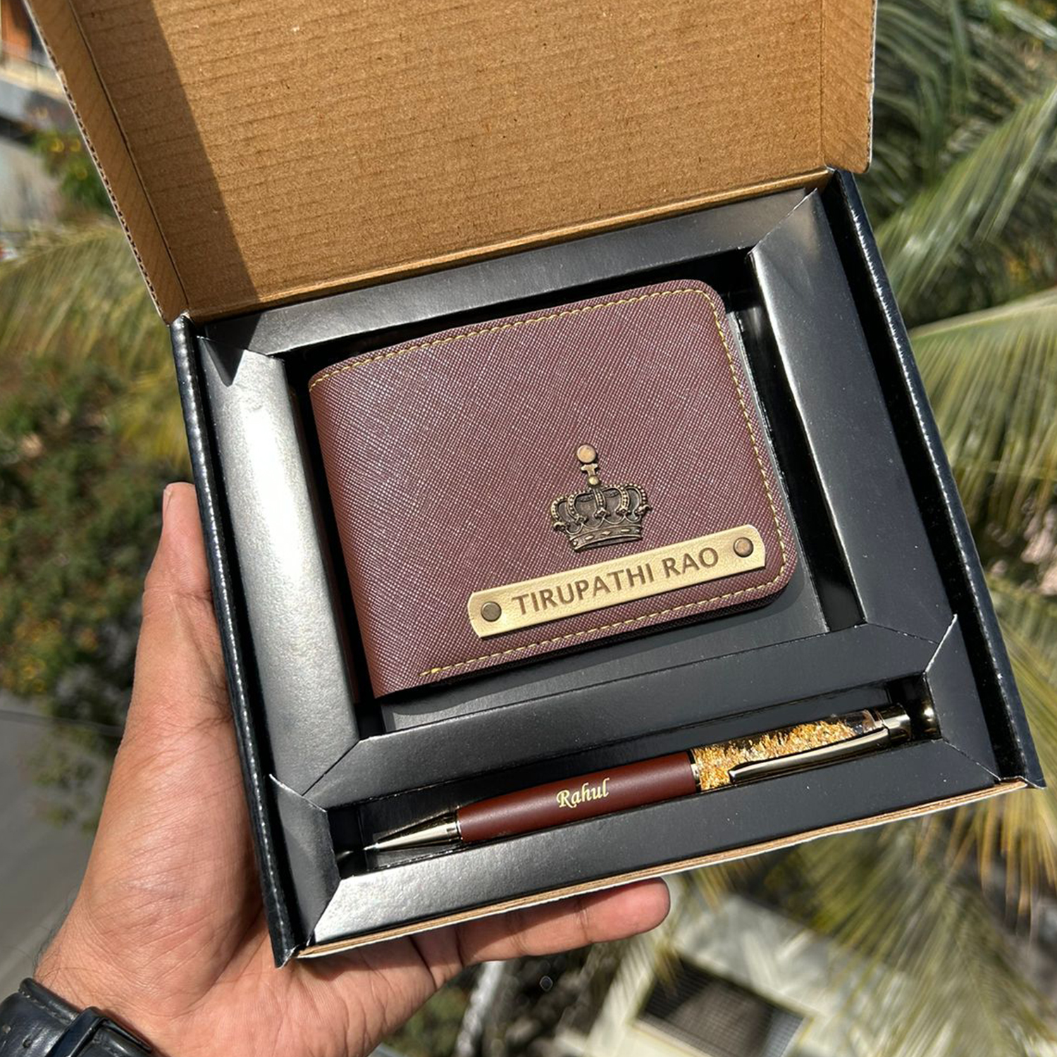 A classy gift set featuring wallet and matching pen with golden finish details. Personalised with name on wallet pen and keychain for a complete premium gifting experience.